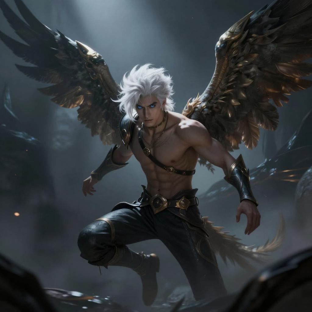 A powerful, muscular man with striking white hair and glowing blue eyes is captured mid-flight with majestic, dark metallic wings. His fantasy warrior attire, detailed with gold accents and leather straps, enhances the dramatic and mythical atmosphere of the dark, misty environment.