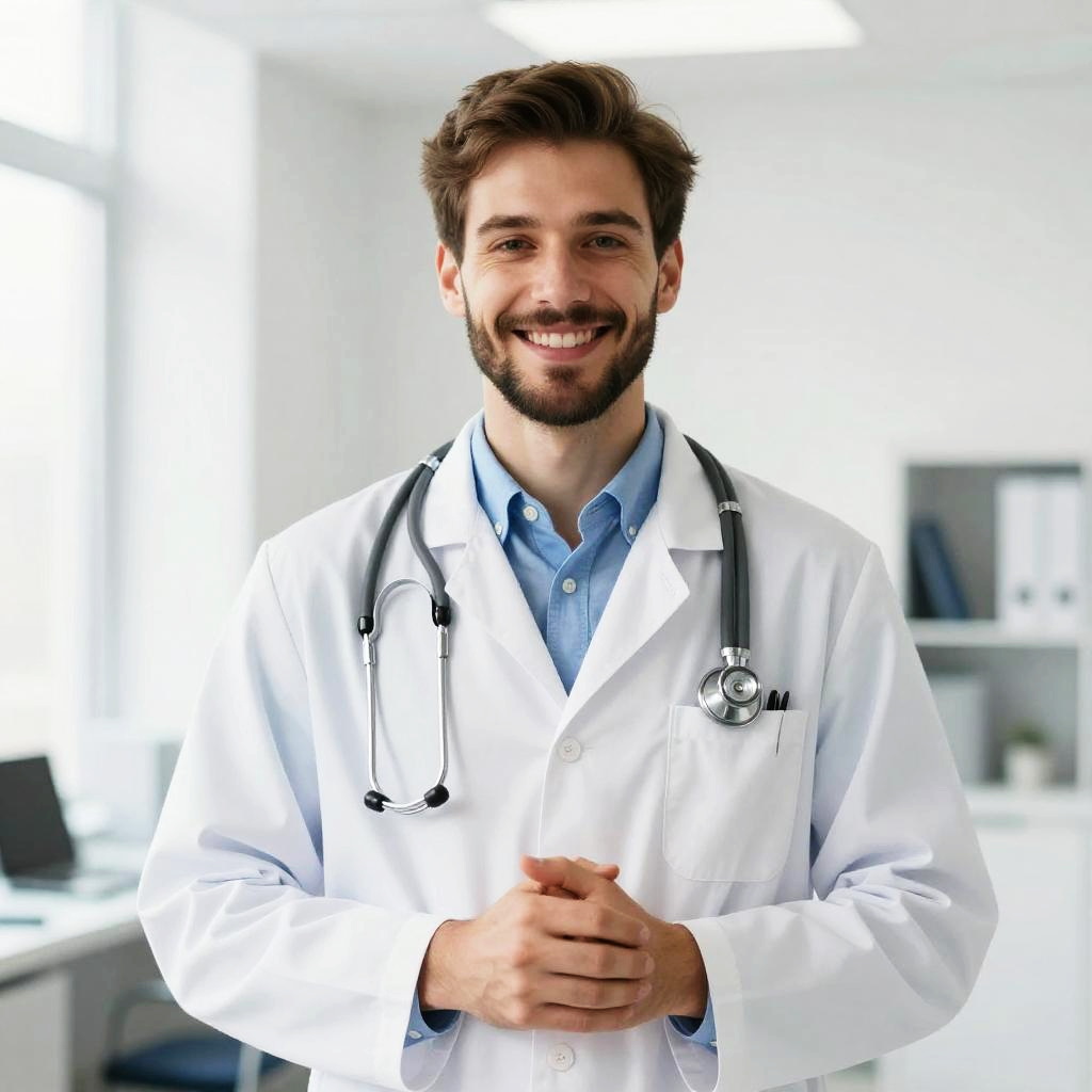 A young male doctor stands confidently in a bright, modern medical office wearing a white lab coat and stethoscope. His friendly smile and neat appearance reflect professionalism and approachability in healthcare.