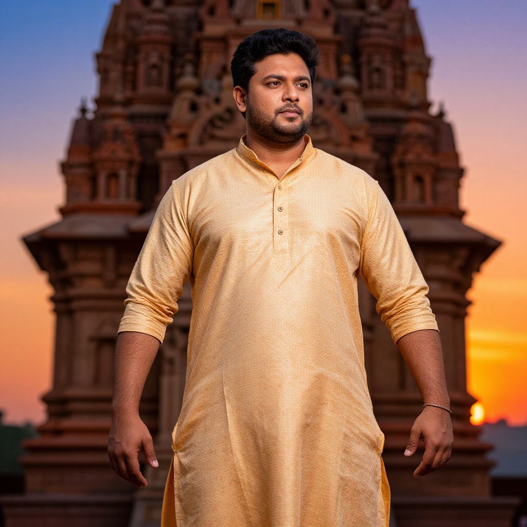 A man dressed in a traditional golden kurta stands confidently in front of an ancient temple during sunset. The warm lighting highlights the intricate details of the temple's architecture, creating a serene and culturally rich atmosphere.