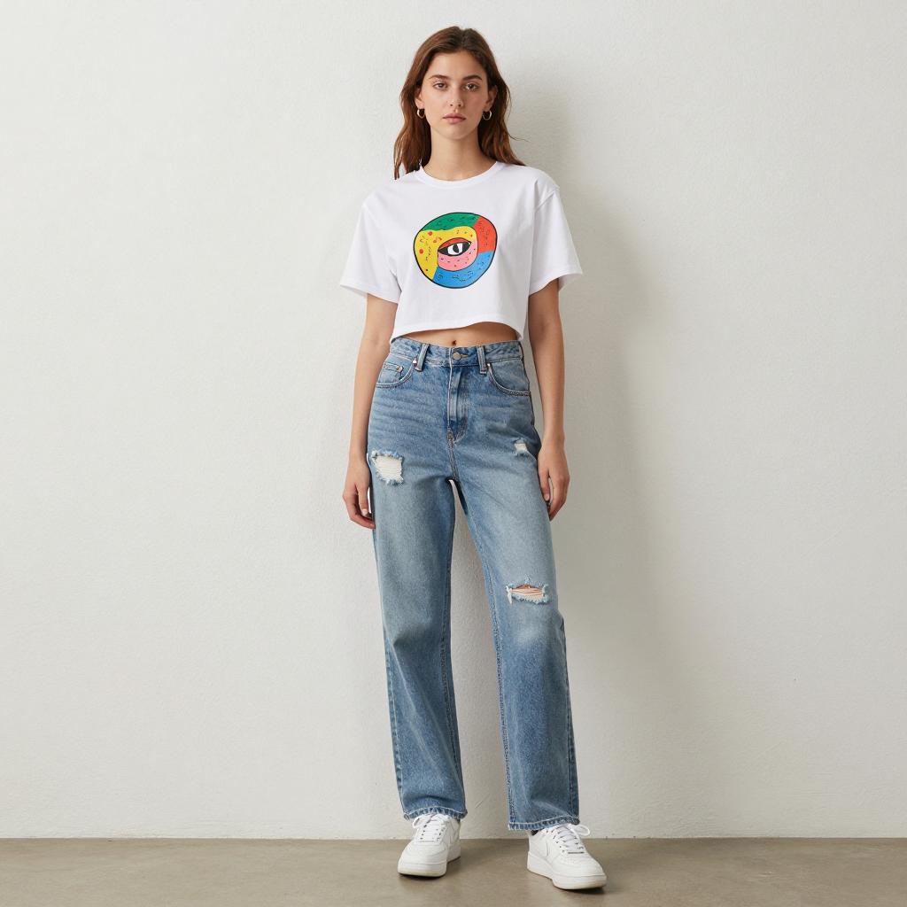 A young woman epitomizing Gen Z casual style stands against a plain background wearing a white cropped t-shirt featuring a colorful, abstract eye graphic paired with high-waisted, relaxed-fit ripped jeans and white sneakers. The outfit highlights a blend of streetwear and contemporary fashion trends popular among youthful, trend-conscious individuals.