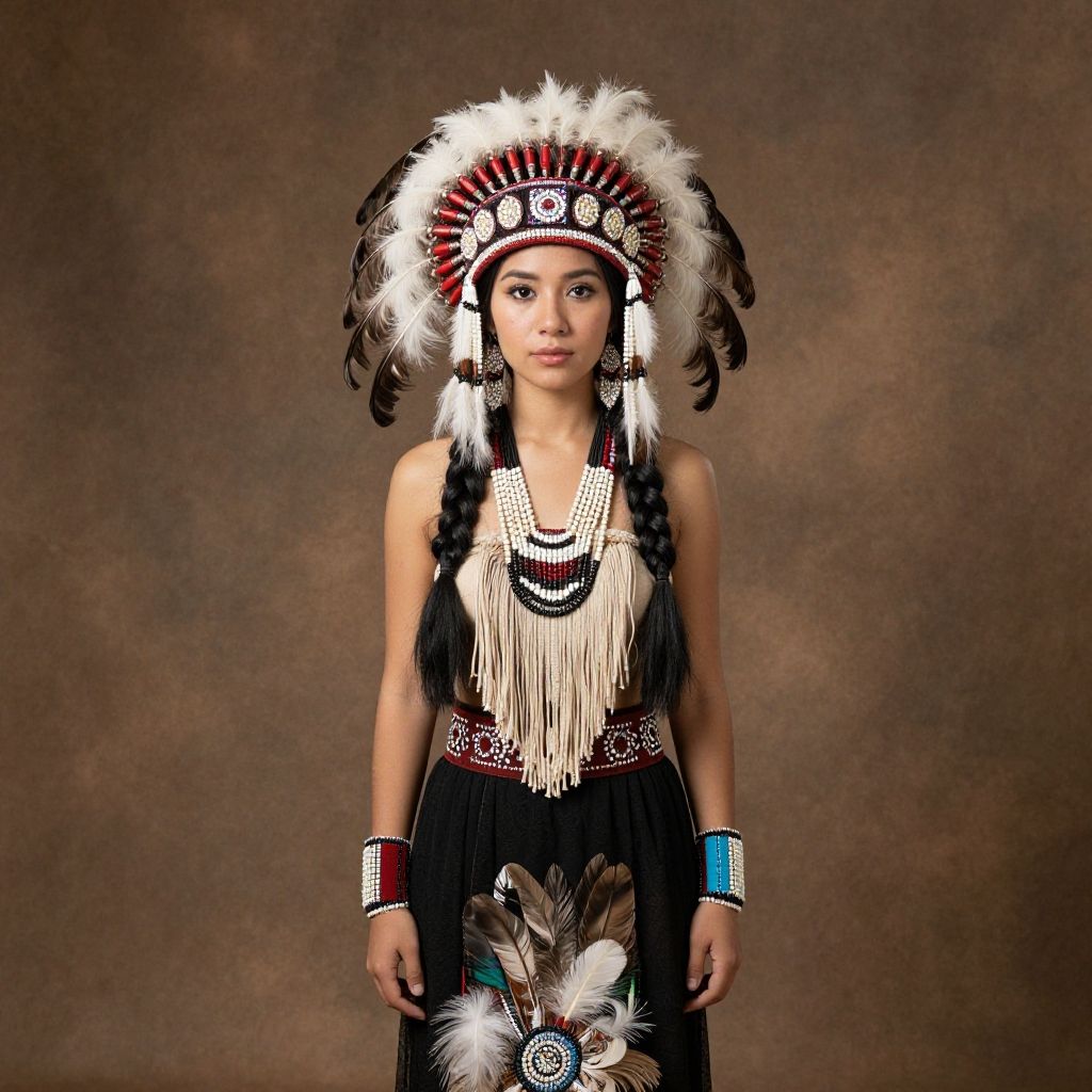 Woman in Traditional Native American-Inspired Feather Headdress and Beaded Attire
