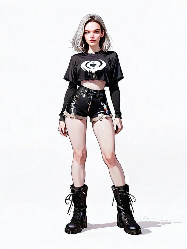 A digitally illustrated woman with silver hair stands confidently in a full body shot, wearing a black cropped top with a graphic design and high-waisted black shorts paired with combat boots. This realistic comic-style artwork combines detailed shading and smooth lines to create a contemporary and edgy look.