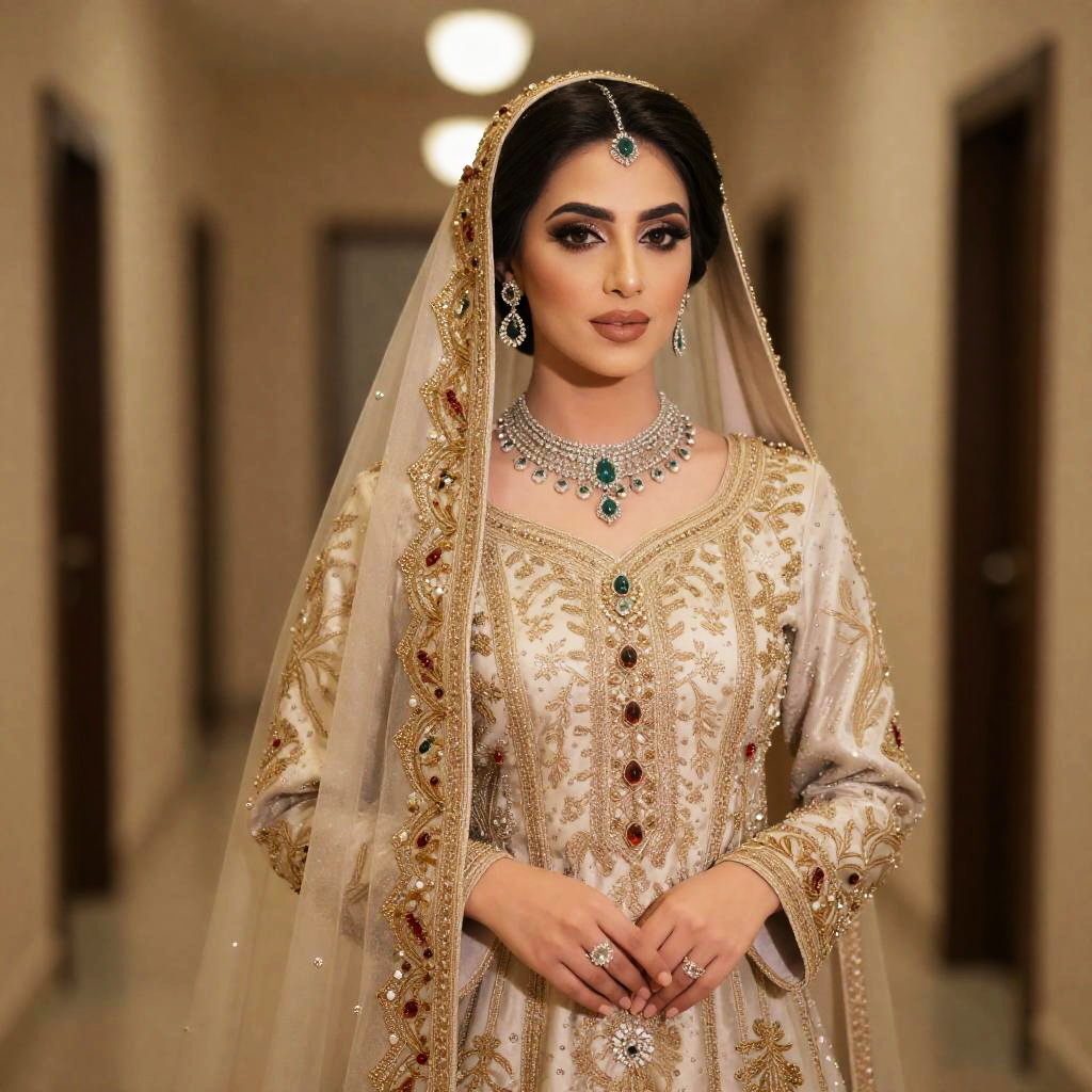 A beautiful woman dressed in a traditional Arab wedding dress featuring intricate gold embroidery and embellishments. She is adorned with elegant jewelry including a statement necklace, earrings, and rings, complemented by a sheer veil with decorative borders.