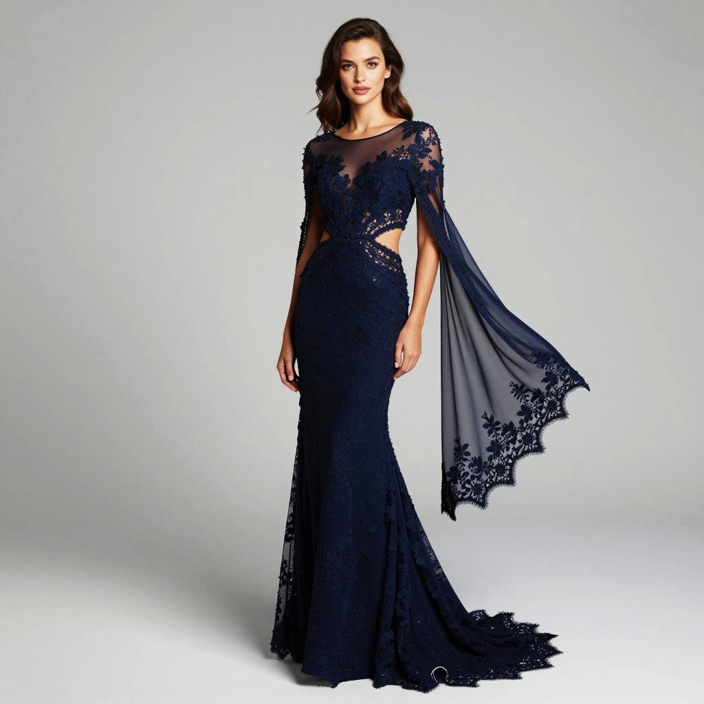 Elegant Navy Blue Lace Evening Gown with Sheer Cape Sleeve