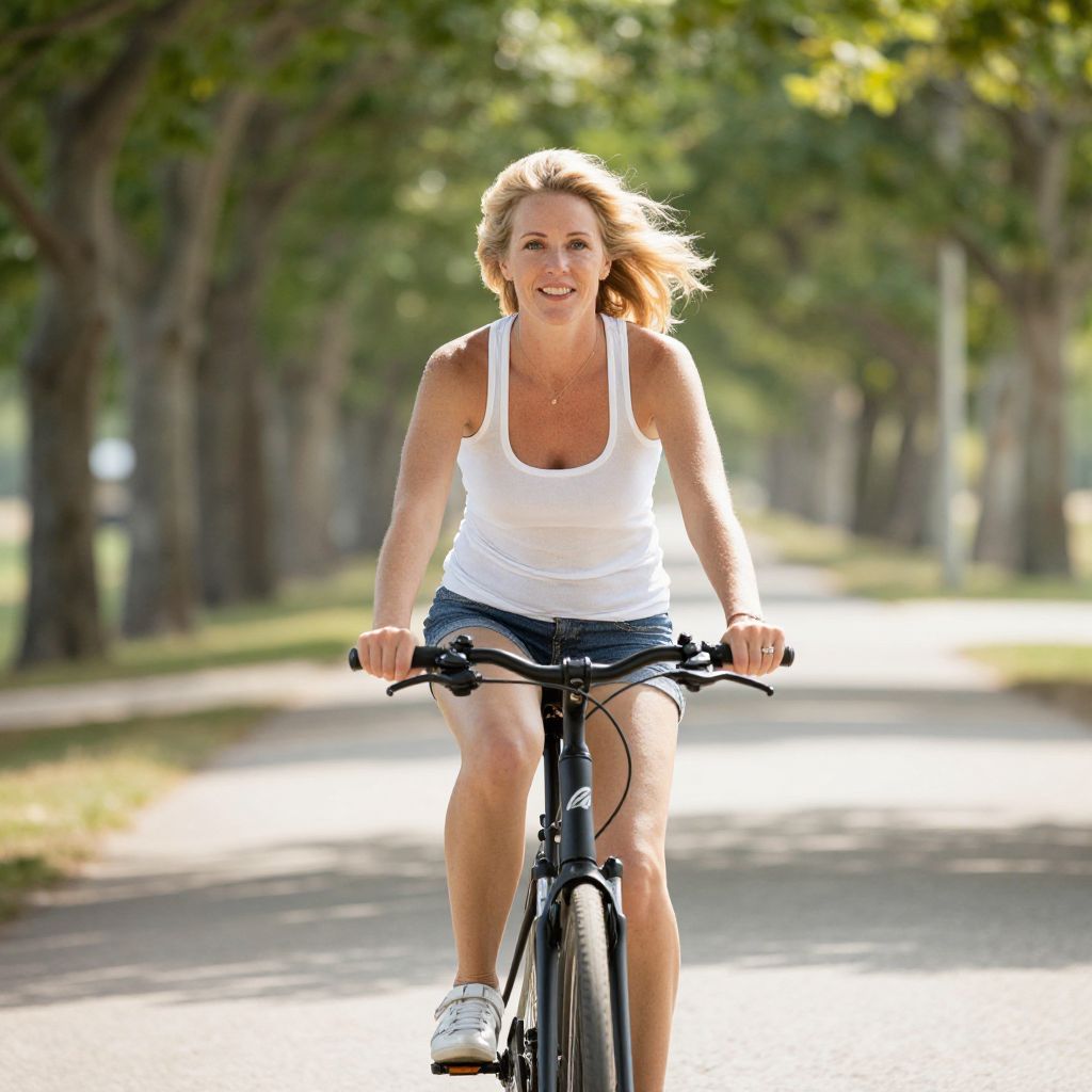 A woman enjoys a sunny day riding her bicycle along a tree-lined path. She wears a white tank top and denim shorts, with a confident and cheerful expression as the breeze flows through her hair.