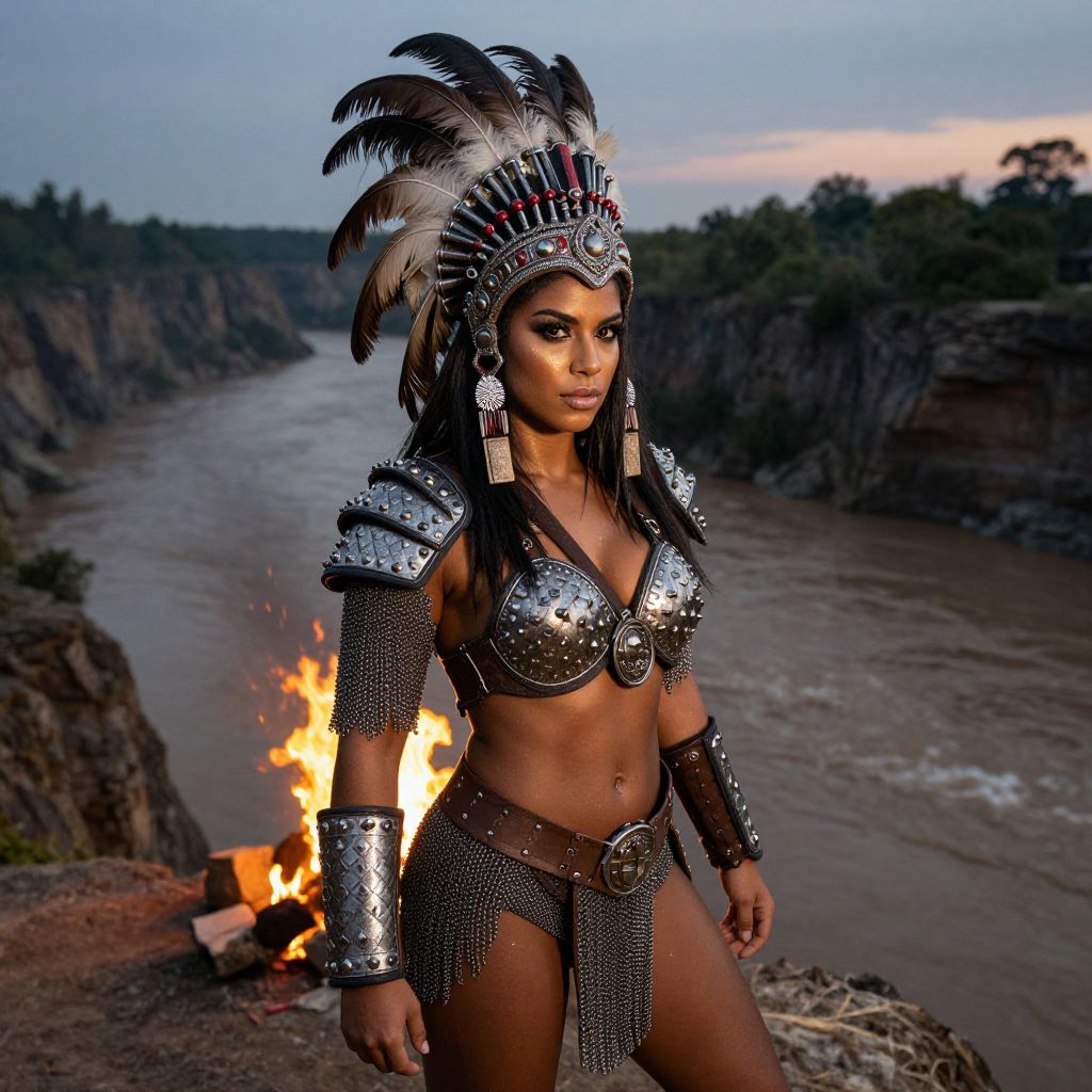 Woman Warrior in Metallic Armor with Feathered Headdress by River at Dusk