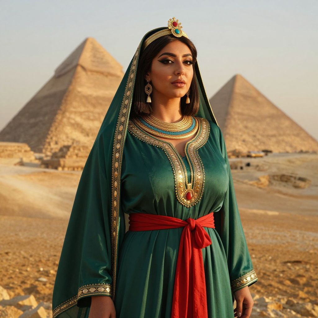 A confident woman dressed in an elegant, traditional green and gold embroidered robe with a red sash poses in front of the iconic Egyptian pyramids at sunset. Her regal attire is complemented by ornate jewelry and a matching headpiece, evoking a blend of contemporary fashion with ancient Egyptian influences.