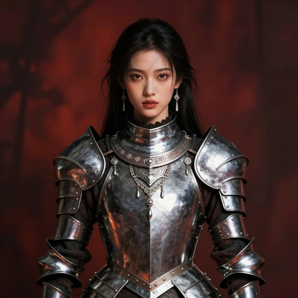 A young woman dressed in polished medieval-style armor poses against a deep red background, embodying a modern interpretation of a fearless warrior. Her intense gaze is complemented by delicate earrings and intricate chains on the armor, blending historical and contemporary aesthetics.