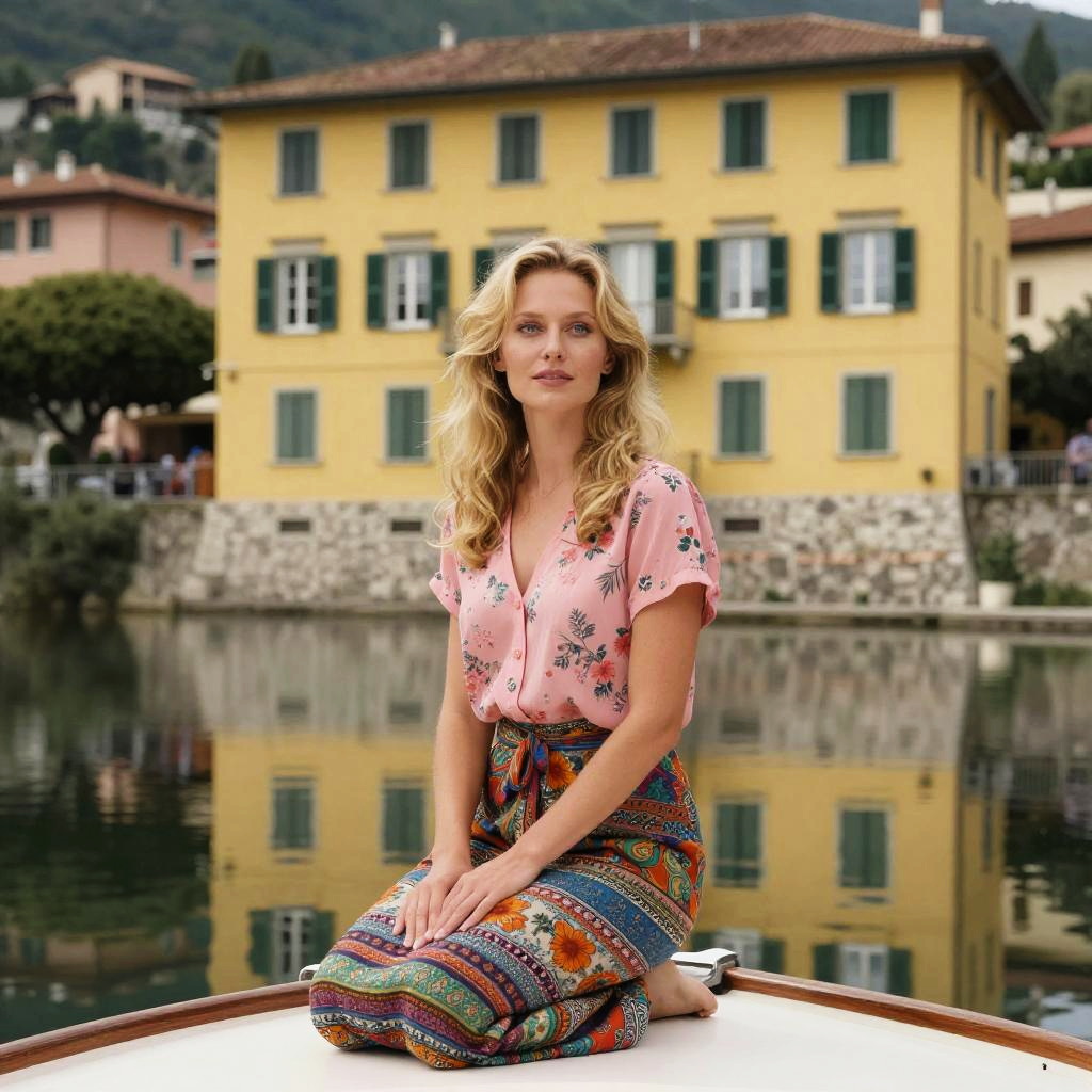 A blonde woman with wavy hair wearing a pink floral blouse and a colorful patterned skirt sits gracefully on a boat by a calm water body. Behind her, a yellow building with green shutters and a stone foundation reflects beautifully in the water, set against a backdrop of trees and hills.