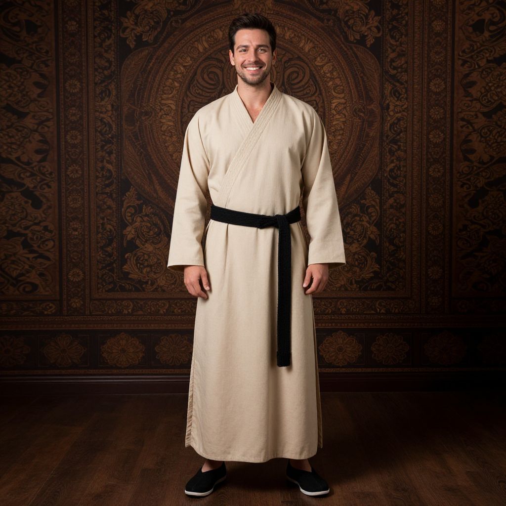 A smiling man stands confidently wearing a beige traditional martial arts gi with a black belt, set against an ornate, darkly decorated backdrop. The warm lighting highlights the fabric texture and intricate patterns on the wall, creating a culturally rich and respectful atmosphere.