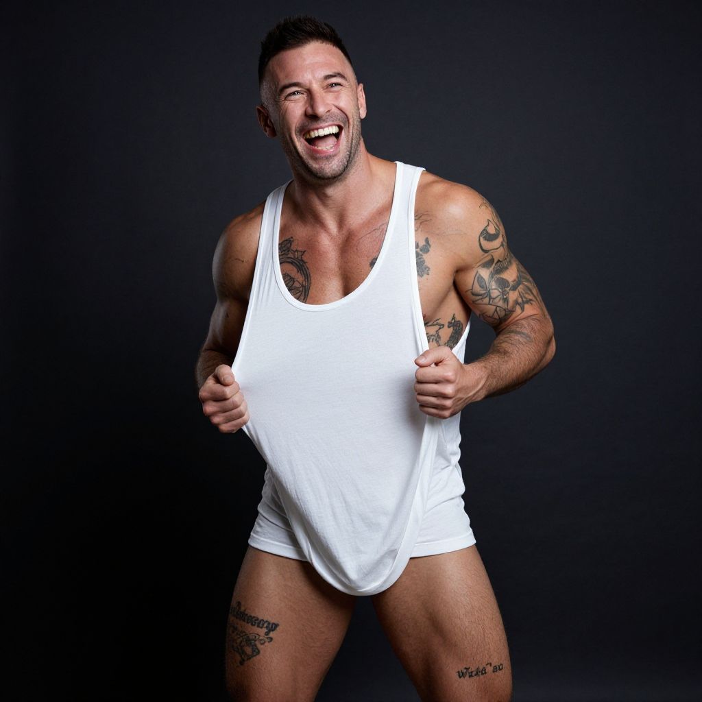 A muscular man with multiple tattoos is laughing joyfully while playfully pulling on his loose white tank top. The studio portrait features a dark background that highlights his energetic and confident expression in a contemporary fitness style.