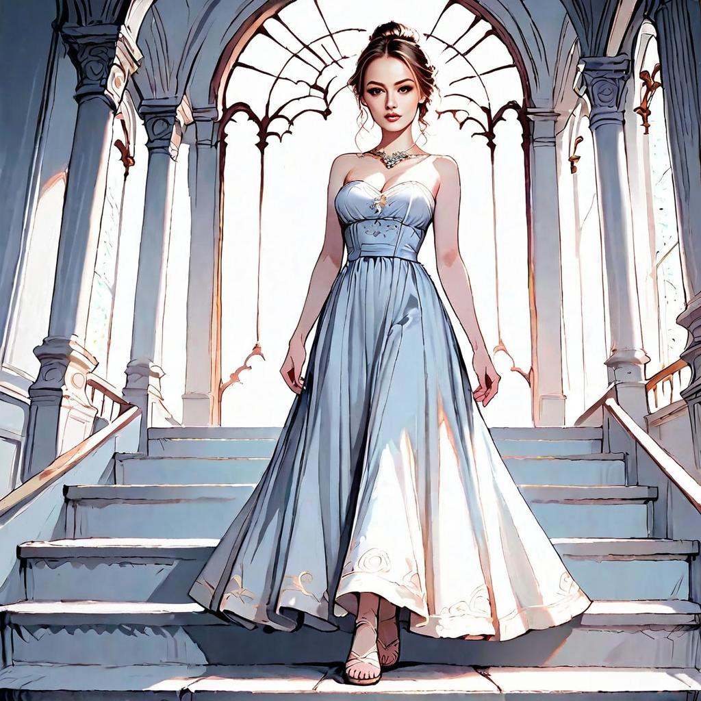 A stylish woman descends a grand staircase inside an architecturally impressive building with tall arches and large windows. She wears an elegant, strapless light blue gown with intricate patterns, complemented by a statement necklace, captured in a digital art style with clear linework and soft shading.