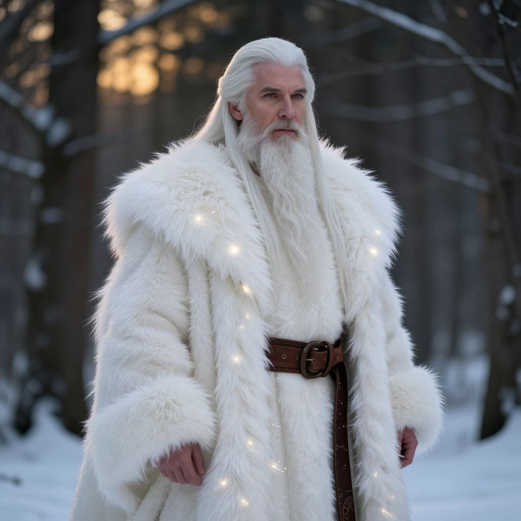 A majestic man with long white hair and beard stands in a snowy forest, dressed in an elegant white fur coat accented with small glowing lights and secured with a brown leather belt. The image evokes a fantasy or medieval style, showcasing a powerful, ethereal figure amidst a winter landscape at dusk.