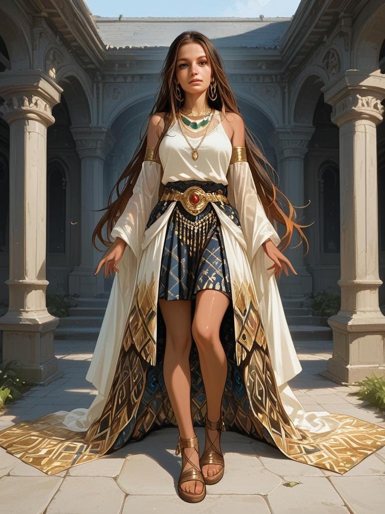 A full-body realistic portrait of a woman in a stylish bohemian-inspired outfit featuring a sleeveless white top paired with an intricate patterned skirt and a flowing long cape with gold and geometric designs. The artwork captures the confident and elegant stance of the woman within a classical architectural courtyard, highlighting detailed textures and natural lighting.