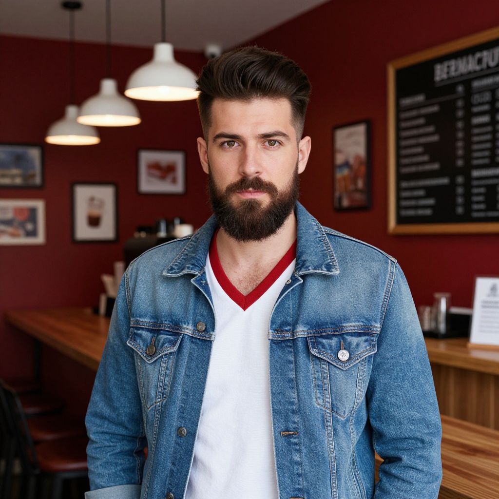A young man with a neatly trimmed beard and styled hair stands confidently in a cozy café setting. He is wearing a denim jacket over a white V-neck shirt with red trim, with warm lighting and framed artwork creating a relaxed atmosphere in the background.