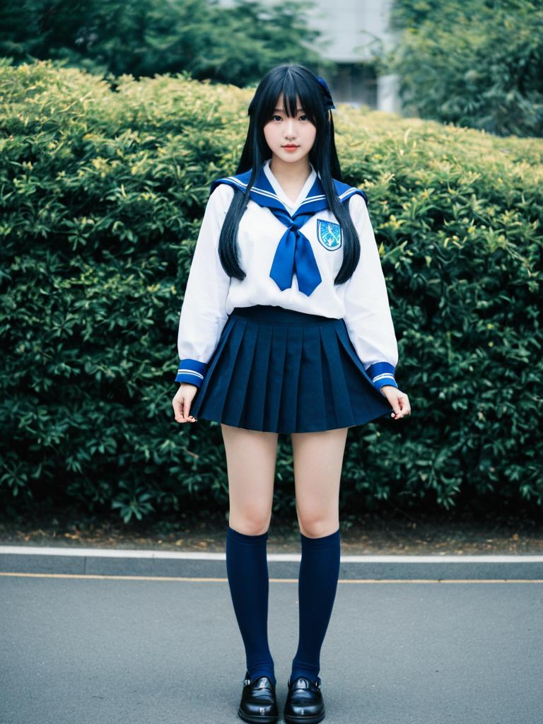 A young woman stands confidently outdoors dressed in a traditional Japanese school uniform consisting of a white blouse with a blue sailor collar, a matching blue pleated skirt, and knee-high socks. The clean and crisp style of the outfit along with the natural background highlights a serene and youthful atmosphere.