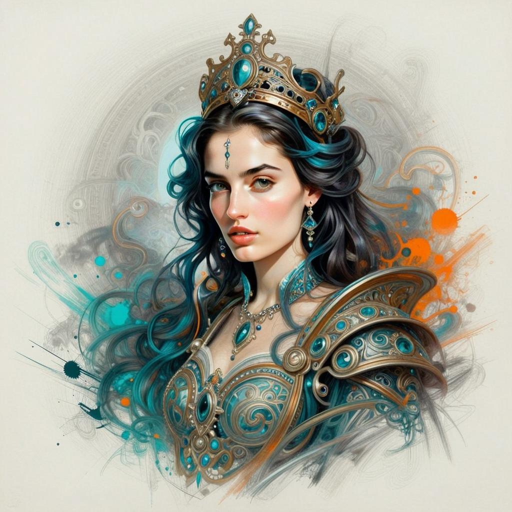A stunning digital portrait of a regal woman adorned with an ornate golden crown and intricate armor embellished with turquoise gems. Her flowing dark hair with blue highlights and the delicate jewelry enhance the fantasy and medieval aesthetic of the artwork, rendered in a detailed and painterly digital style.