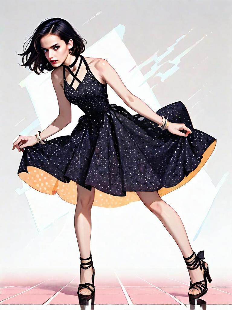 This realistic digital illustration features a stylish woman in a full-body shot, wearing a dark, star-patterned dress with a halter neckline and strappy details. The artwork captures a dynamic pose with a contemporary, comic-inspired style, highlighting elegant high-heeled sandals and a confident expression.