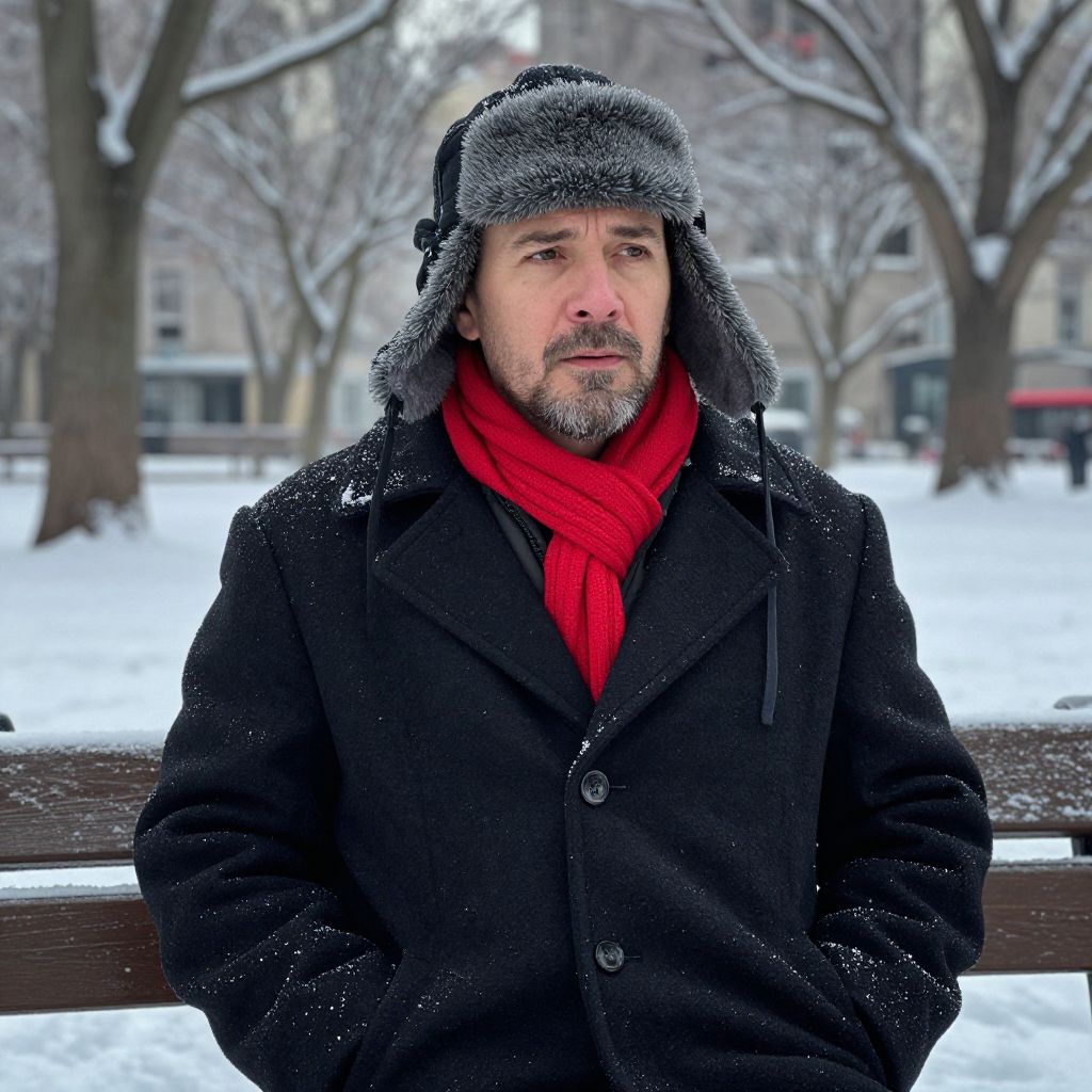 A man dressed warmly in a black coat, red scarf, and fur-lined trapper hat sits thoughtfully on a bench in a snowy park. The soft snowfall dusts his coat and the surrounding trees, creating a serene winter scene.
