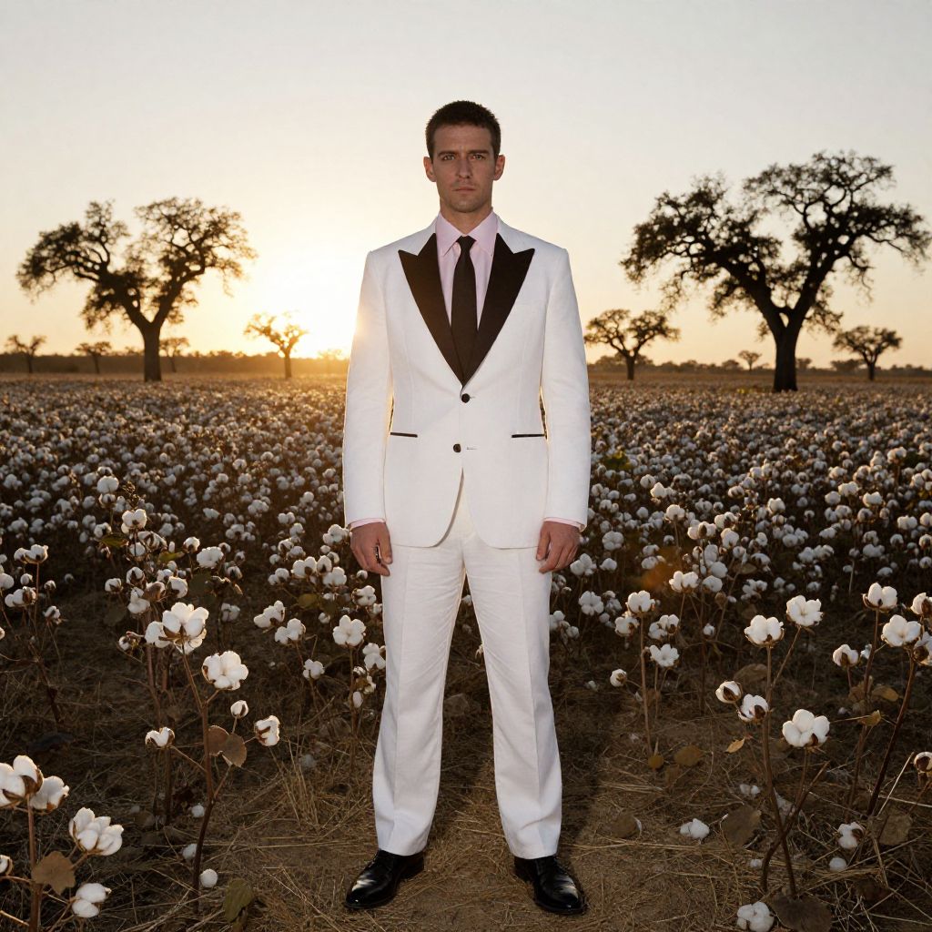 A man stands confidently in a white suit with black lapels amidst a blooming cotton field at sunset. The warm golden light highlights the contrast between the formal attire and the natural rural landscape, creating a striking and dramatic composition.