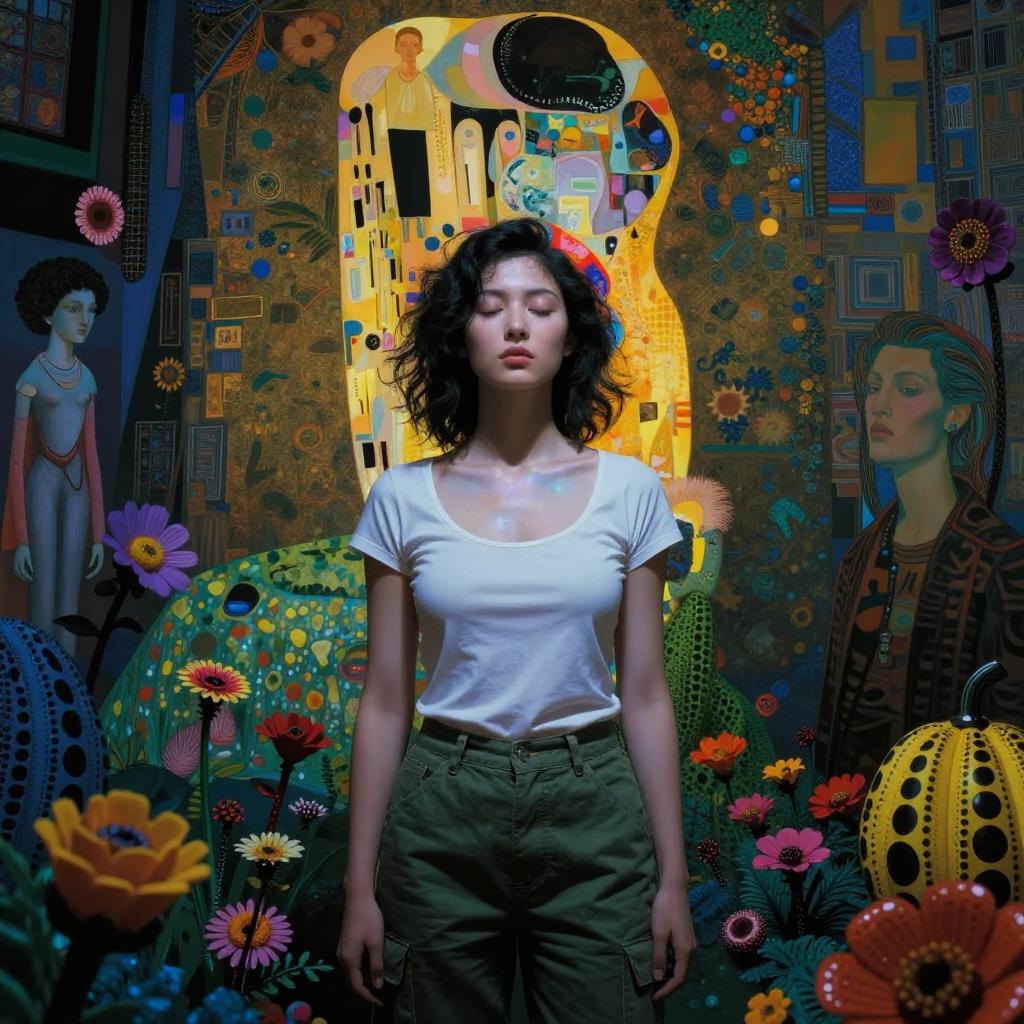 A young woman stands peacefully with her eyes closed amid a vibrant background of surreal and colorful artwork featuring abstract human figures and floral patterns. The scene combines contemporary portraiture with elements inspired by Klimt's decorative style and psychedelic, dreamlike visuals.