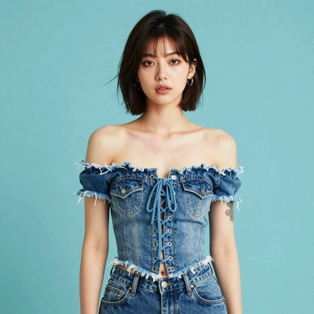 A young woman poses against a solid blue background wearing a trendy off-shoulder denim corset top and matching high-waisted denim jeans. The outfit features frayed edges and lace-up details, highlighting a contemporary casual denim style popular with Gen Z fashion.