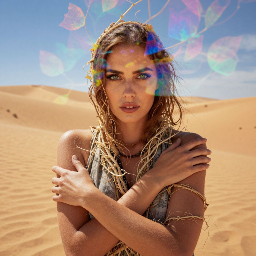 A striking woman stands in the vast desert dunes, wrapped in natural vines and branches that entwine her arms and head like a crown. The image features a dreamy double exposure effect with colorful leaves overlaying her face, blending fashion and nature in a surreal, artistic portrait.