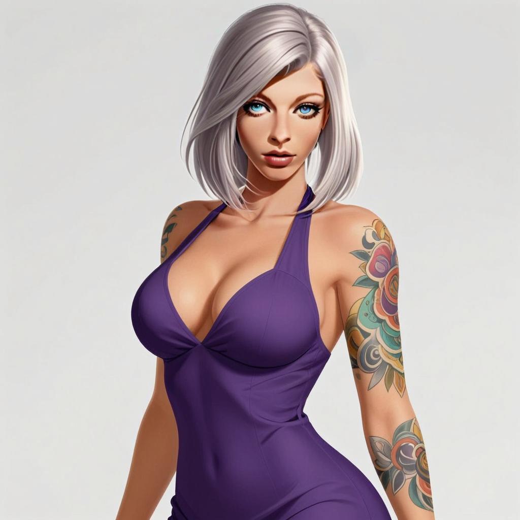 A striking digital artwork of a confident woman with silver bobbed hair, piercing blue eyes, and colorful floral tattoos adorning her arms. She is dressed in a form-fitting purple halter dress that complements her edgy yet elegant style, rendered in a highly detailed, semi-realistic style with smooth shading and vibrant colors.