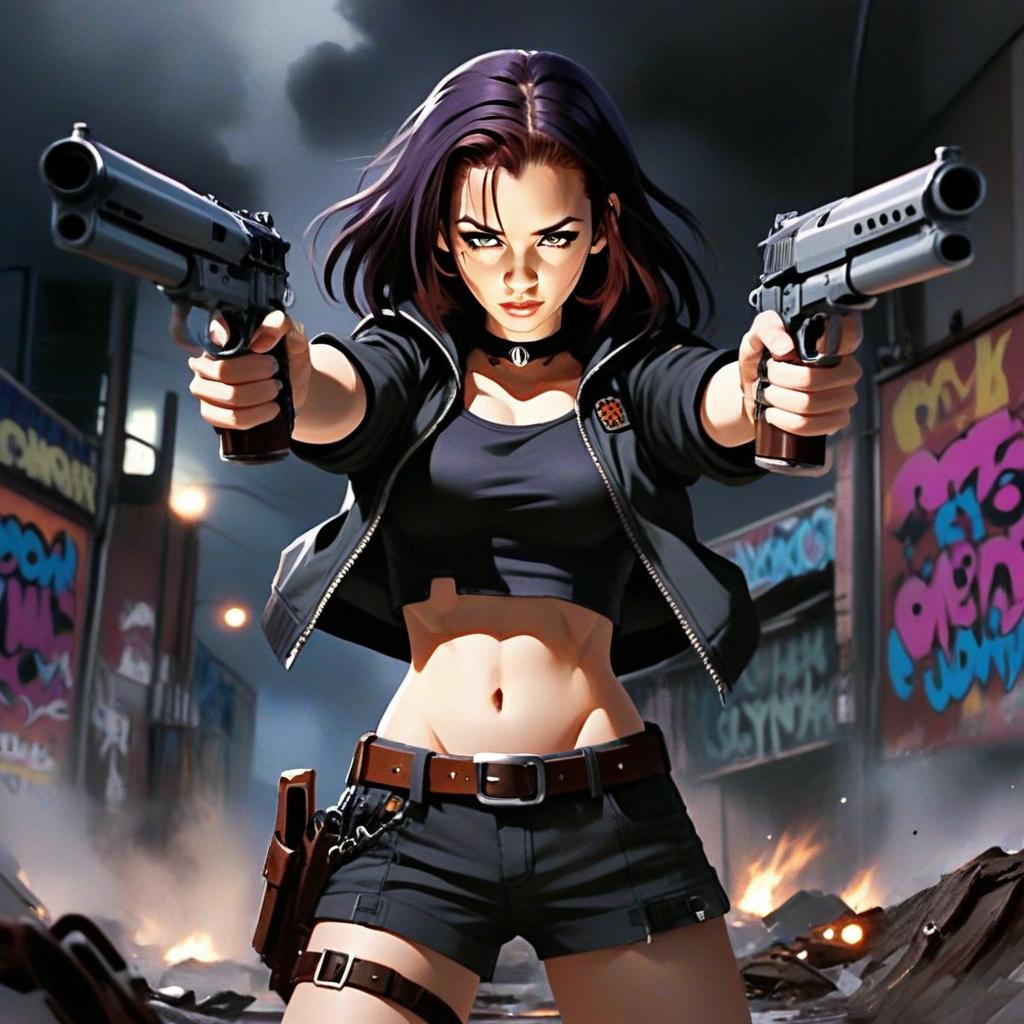 Cyberpunk Woman Dual-Wielding Pistols in Urban Graffiti Alley