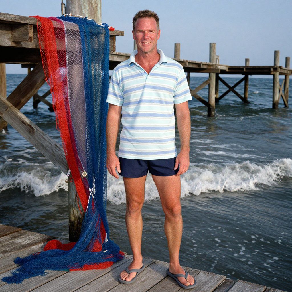 A middle-aged man stands confidently on a wooden pier by the sea, dressed casually in a striped polo shirt, navy shorts, and flip-flops. Behind him, fishing nets in red, white, and blue hang from the pier, and gentle waves crash against the shore under a clear sky.