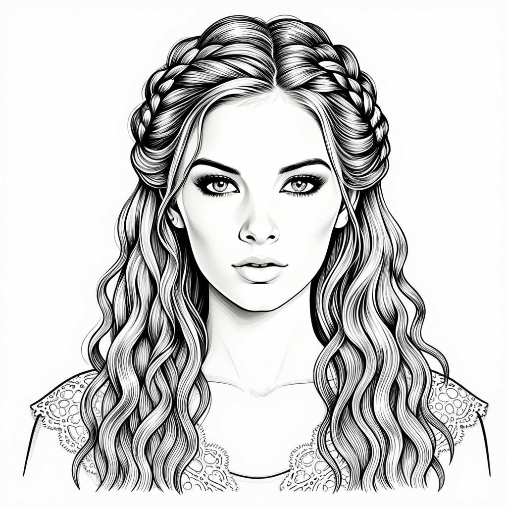 Detailed Black and White Portrait Illustration of a Woman with Braided Hair