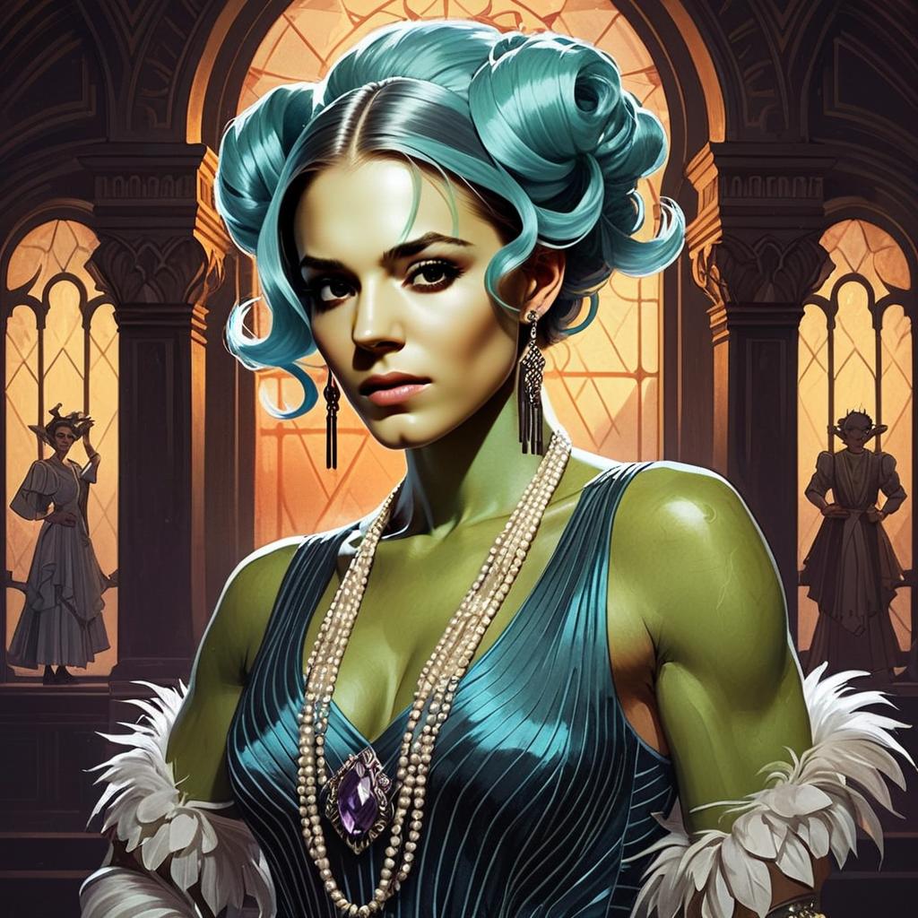 A striking portrait of a green-skinned woman with teal hair styled in elegant buns, dressed in a teal evening gown adorned with pearl necklaces and a large amethyst pendant. The image is set in a grand, ornate hall with warm lighting and a gothic architectural background, evoking a dramatic fantasy or sci-fi atmosphere. This highly detailed digital artwork combines realism with fantasy elements, reflecting an imaginative and sophisticated art style.