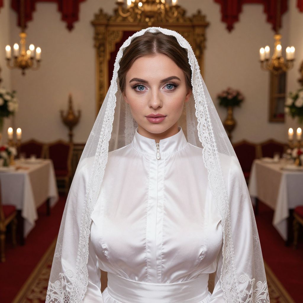 Elegant Bride in Traditional White Gown with Lace Veil in Vintage Setting