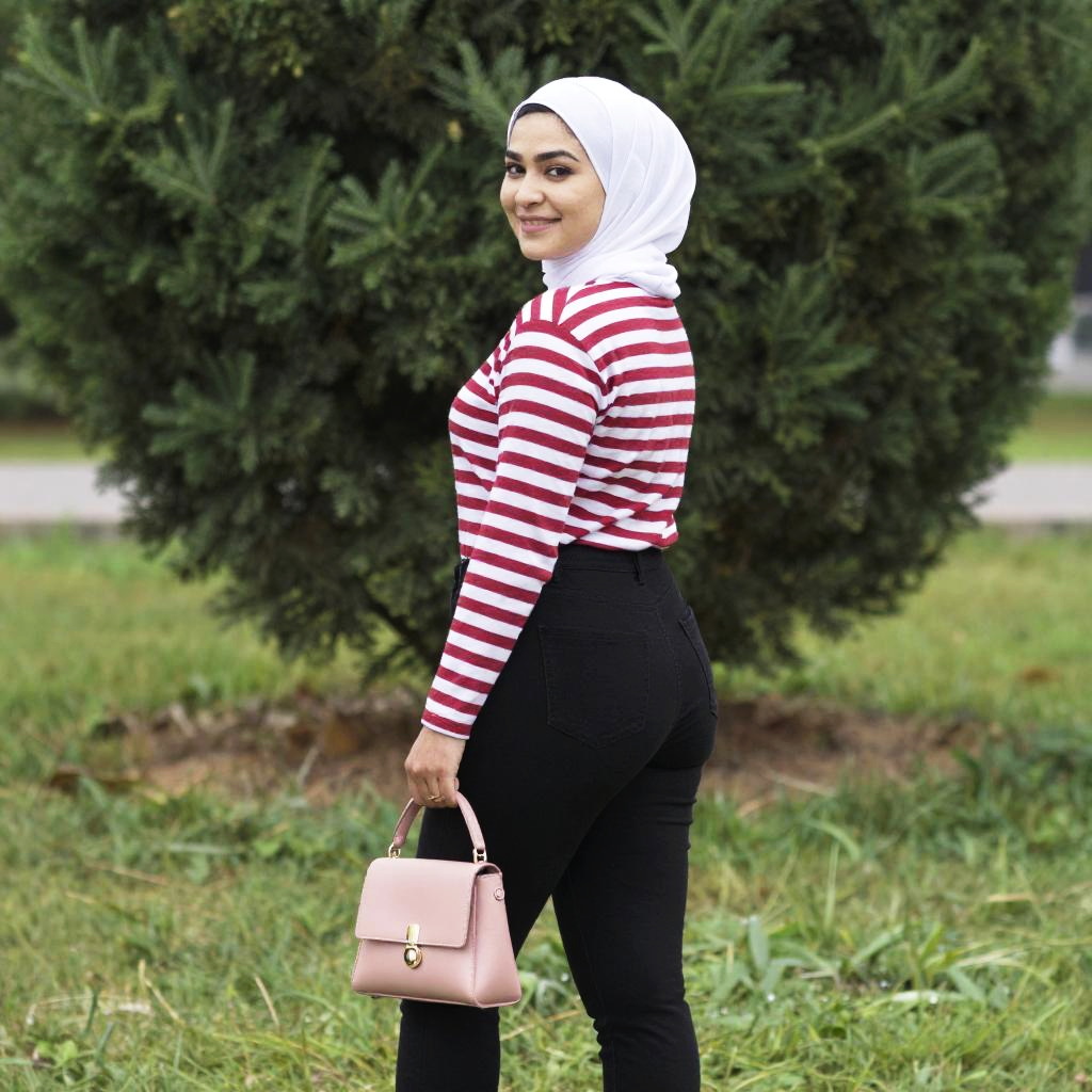 A smiling woman wearing a white hijab and a red-and-white striped top stands outdoors on a grassy area. She is holding a light pink handbag and looks over her shoulder, showcasing a casual yet stylish look against a backdrop of greenery.