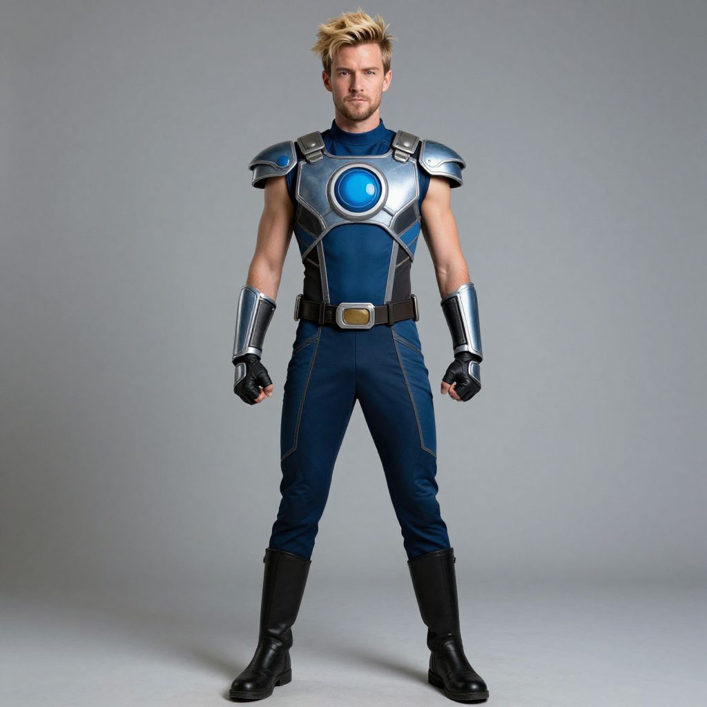 A confident man stands in a futuristic blue and silver armored costume with metallic shoulder pads and gauntlets, exuding a sci-fi superhero vibe. The outfit features a glowing circular emblem on the chest, paired with black boots and fingerless gloves, against a plain gray background.