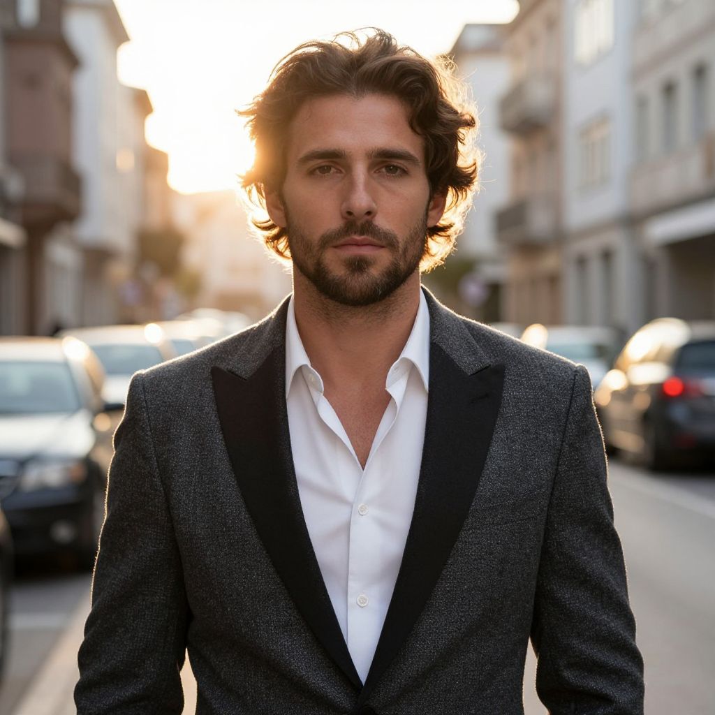A confident man with wavy hair and a trimmed beard stands on a city street at sunset, wearing a sharp grey blazer with black lapels over a white shirt. The warm sunlight behind him creates a glowing halo effect, enhancing the sophisticated and stylish urban portrait.