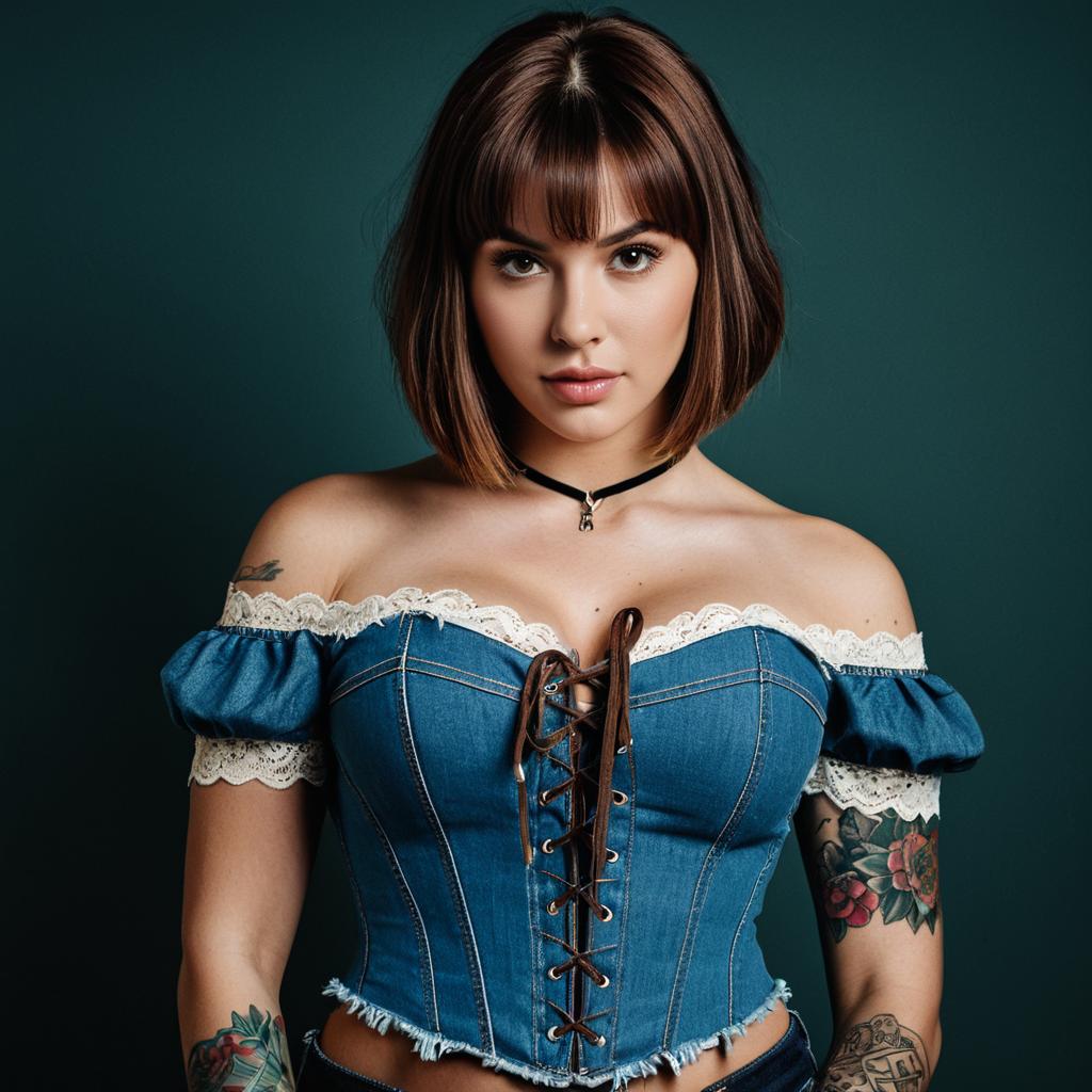 A confident young woman with short brown hair and bangs poses against a dark teal background. She wears a stylish off-shoulder denim corset top with lace details and displays several colorful tattoos on her arms, enhancing her modern, edgy look.