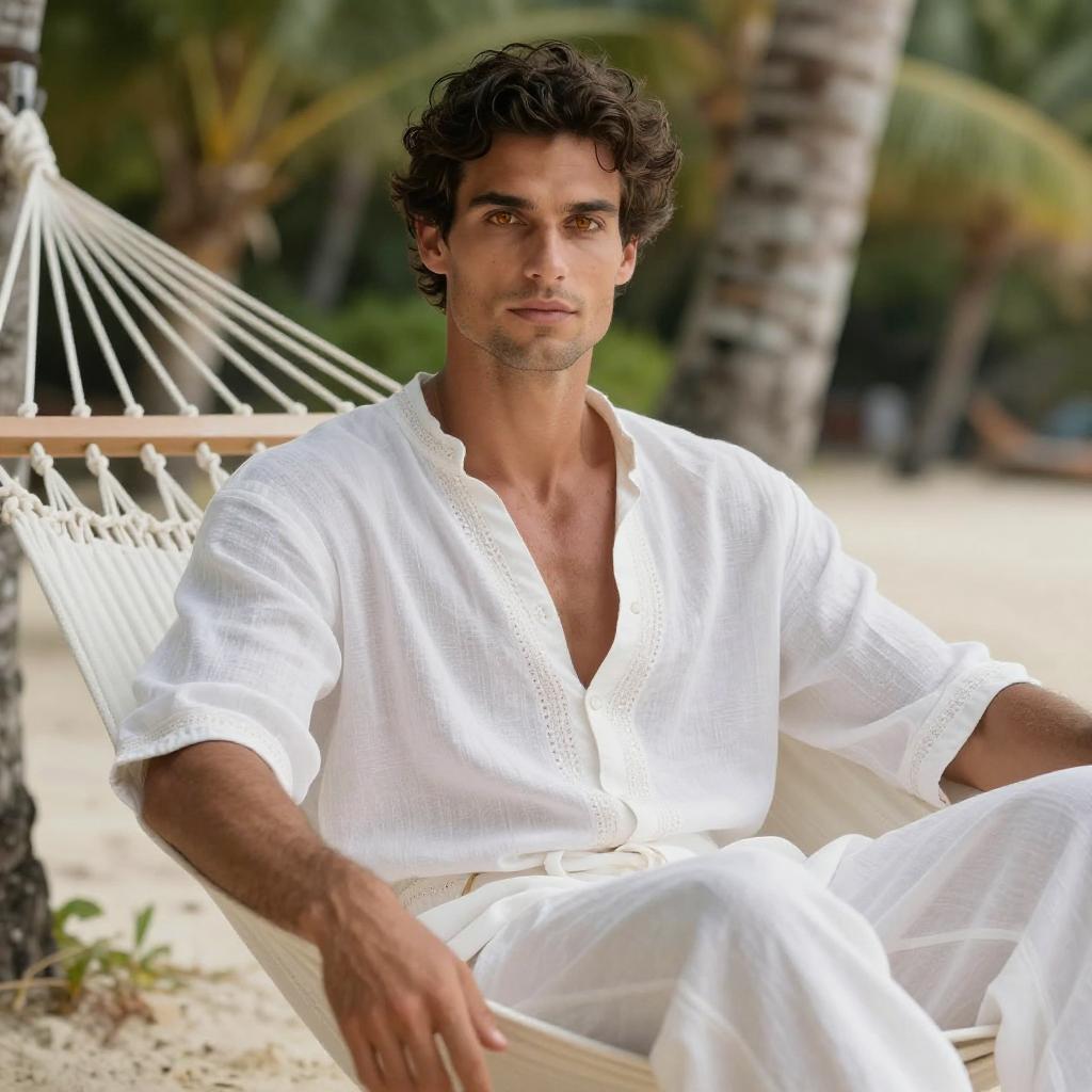 A young man with curly dark hair relaxes on a hammock at a tropical beach, dressed in a loose white linen shirt and matching pants. The natural beach setting with palm trees in soft focus enhances the serene and laid-back atmosphere of this summer lifestyle portrait.