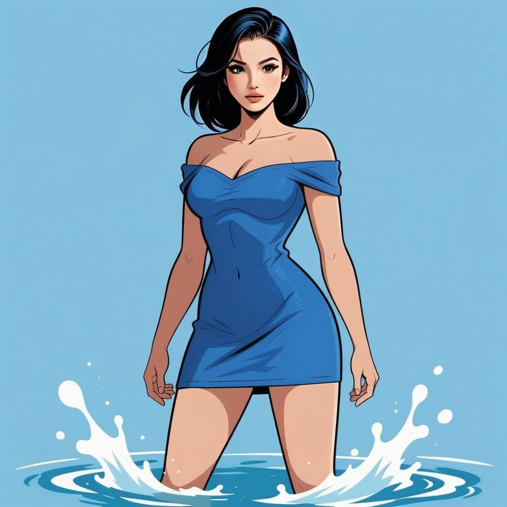 A digitally illustrated young woman stands confidently in shallow water, wearing a stylish off-shoulder blue dress. The artwork features clean lines and vibrant colors, embodying a modern comic or pop art style with a smooth, polished finish.