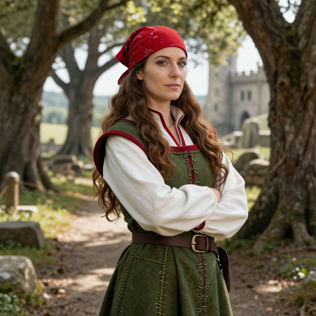 A confident woman stands outdoors in a medieval-inspired outfit, consisting of a green dress with red trims, a white blouse, and a red headscarf. She is positioned on a wooded path with trees surrounding her and an ancient stone castle visible in the background, evoking a historical or fantasy setting.