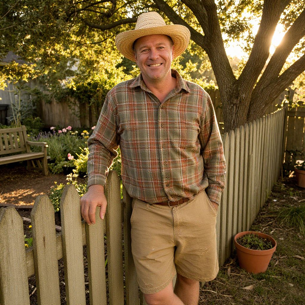 A middle-aged man wearing a straw hat, plaid shirt, and khaki shorts stands smiling confidently by a wooden picket fence in a sunny garden. The warm light filtering through the trees highlights the relaxed and welcoming atmosphere of this outdoor scene.