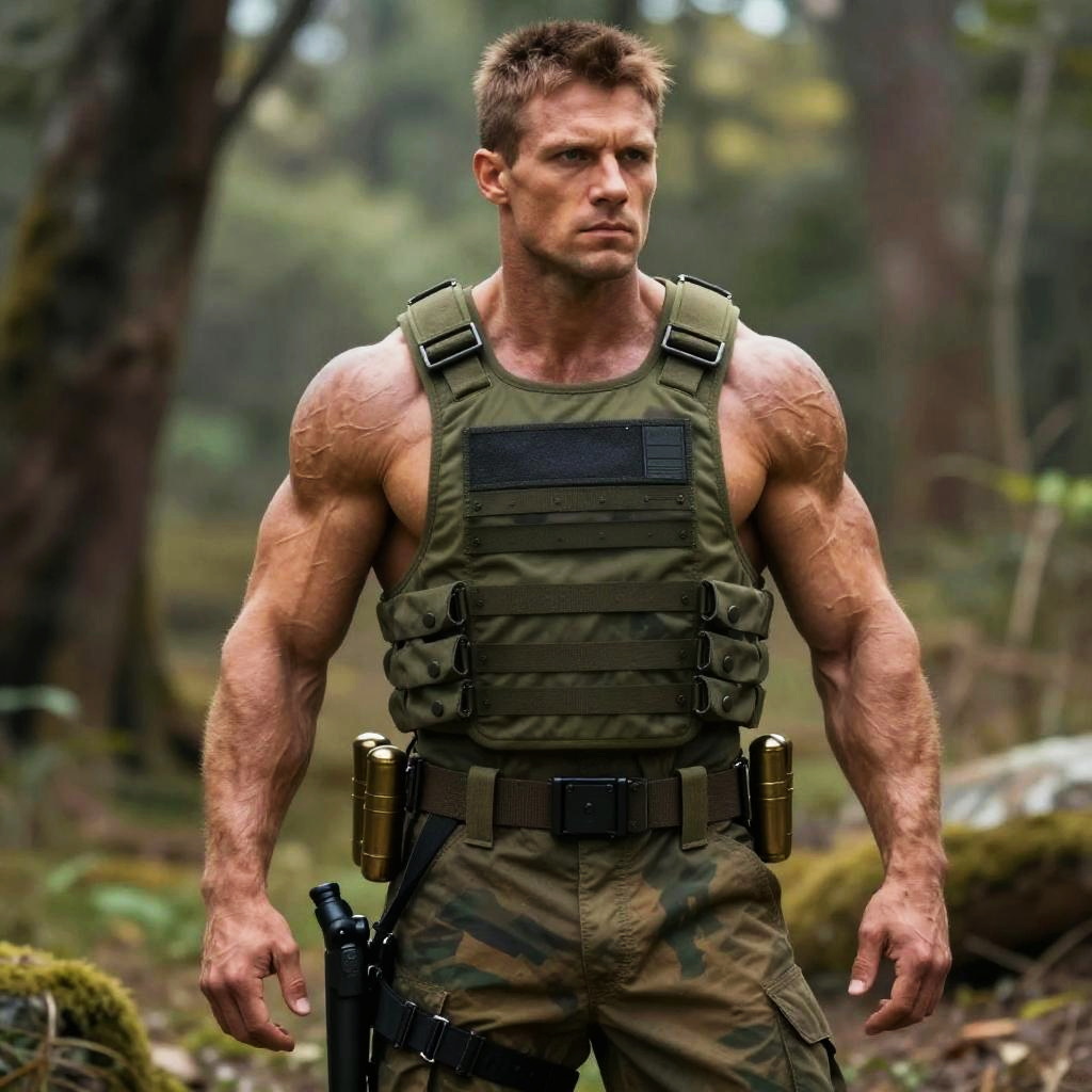 A muscular man stands confidently in a forest setting wearing tactical military gear, including a green bulletproof vest and camouflage pants. His intense expression and strong physique highlight a readiness for action in a rugged outdoor environment.