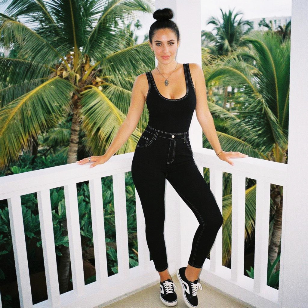 A woman with an hourglass figure poses confidently on a balcony surrounded by lush palm trees. The image features a lomography analog photo style, highlighting vibrant colors and a vintage film-like texture, while she wears a fitted black outfit and sneakers.
