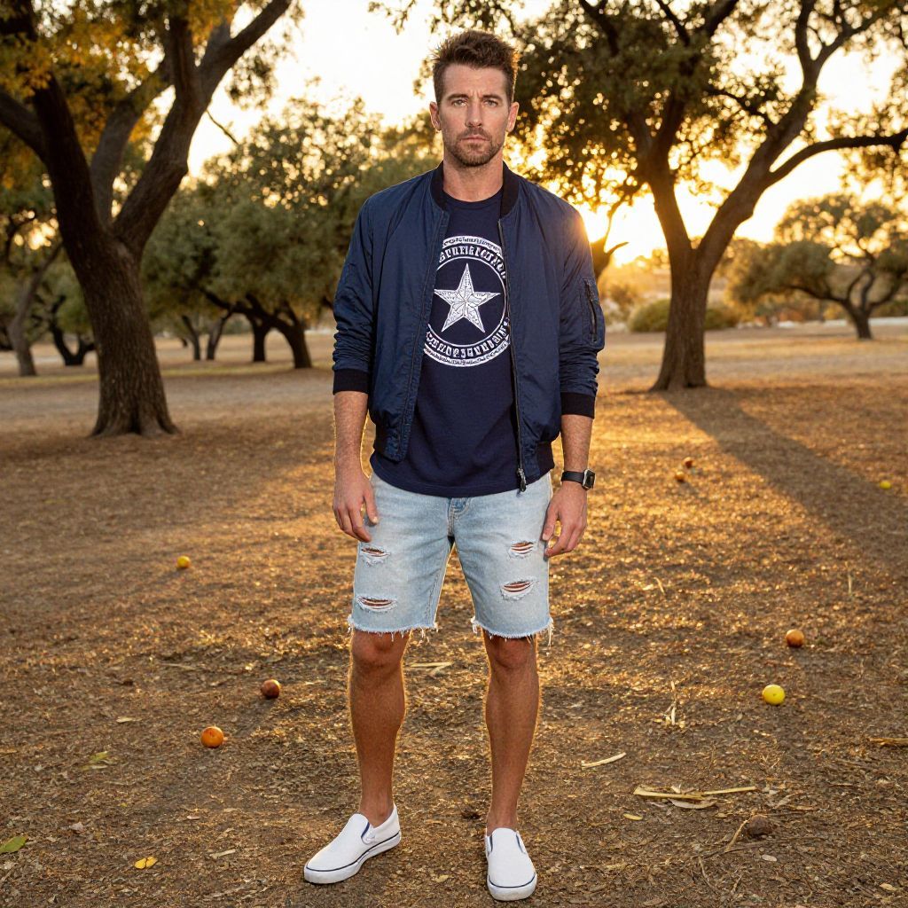 A man stands confidently in a sunlit park during the golden hour, surrounded by scattered fruits on the ground and trees in the background. He wears a navy bomber jacket, a printed navy t-shirt, ripped denim shorts, and white slip-on shoes, creating a casual yet stylish look.