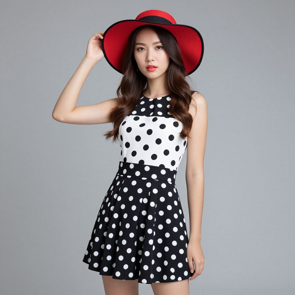 A stylish young woman poses confidently wearing a chic black and white polka dot dress paired with a striking red wide-brimmed hat. The classic polka dot pattern contrasts with the modern, elegant design, making this a timeless and fashionable portrait.