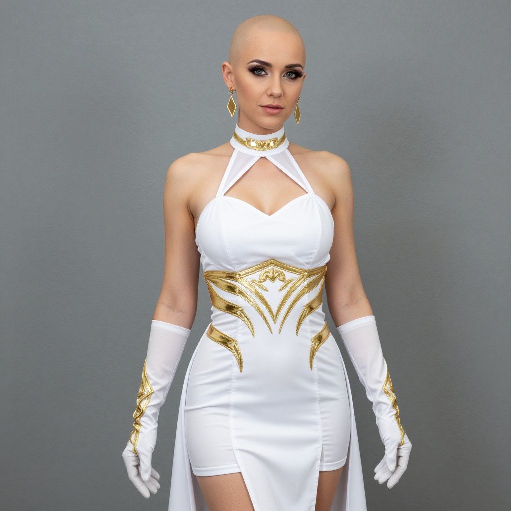 A confident bald woman poses against a gray backdrop wearing an elegant white dress with gold accents and matching gloves, embodying a futuristic and regal aesthetic. The halter-style dress features intricate golden detailing and a cape-like extension, complemented by matching gold earrings and bold makeup.