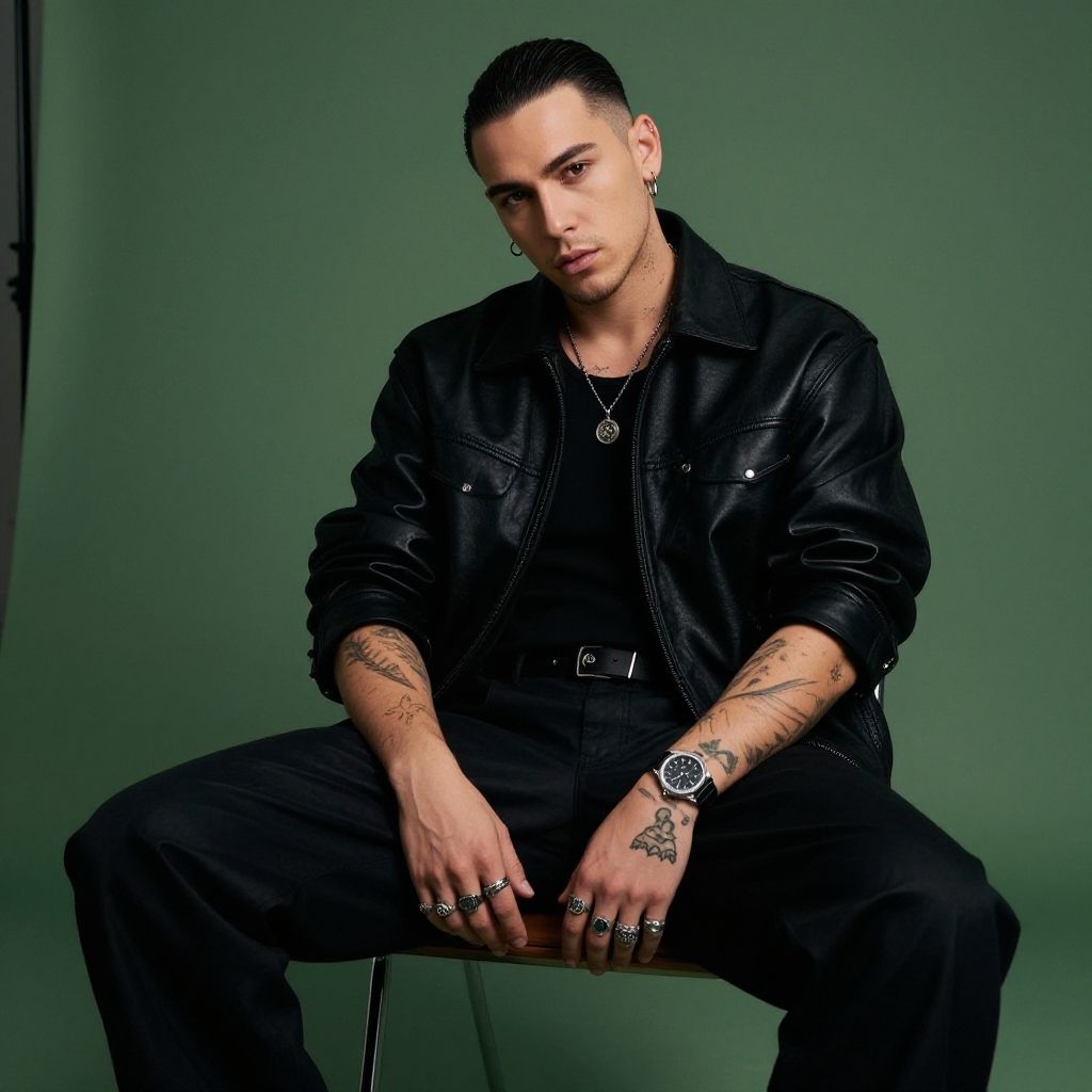 A young man with a confident and contemplative expression sits against a muted green background. He is dressed in a stylish black leather jacket and black pants, adorned with multiple rings, a necklace, and tattoos on his forearms, embodying a modern edgy fashion style.