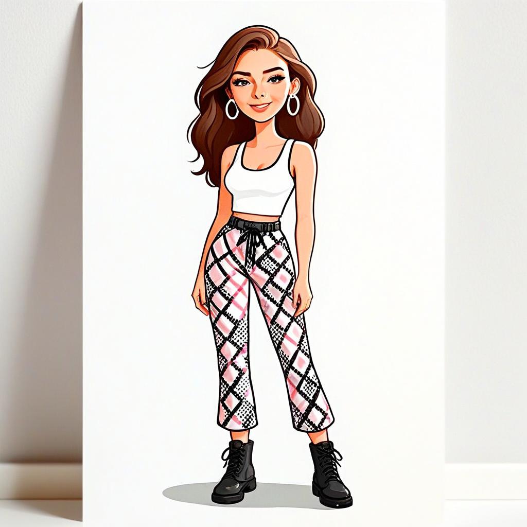 A stylish cartoon illustration of a woman with a pretty face and flowing brown hair, dressed casually in a white tank top and patterned pants. Her confident stance is complemented by hoop earrings and black combat boots, showcasing a modern streetwear style.