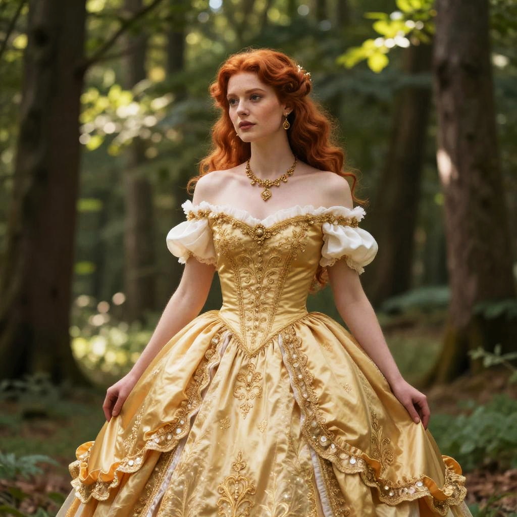 A woman with vibrant red hair stands gracefully in a lush forest, dressed in an elaborate golden Victorian-style gown adorned with intricate embroidery and delicate puffed sleeves. The soft natural lighting highlights the ornate details of her dress and the elegant jewelry she wears, evoking a timeless, romantic atmosphere.