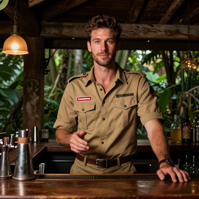 A man wearing a khaki utility-style shirt with patches stands behind a wooden bar counter in a tropical, rustic setting. The background features lush greenery and warm ambient lighting, creating a cozy yet adventurous atmosphere.